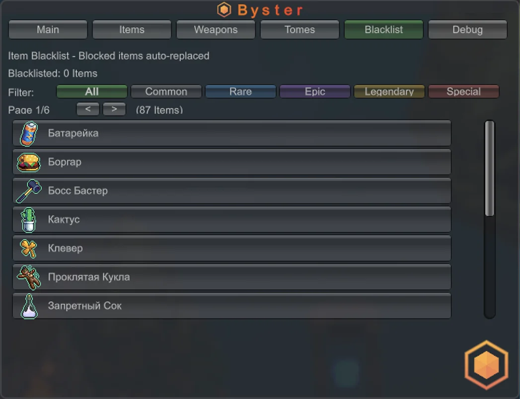- Сброс выбранной редкости улучшений и предметов