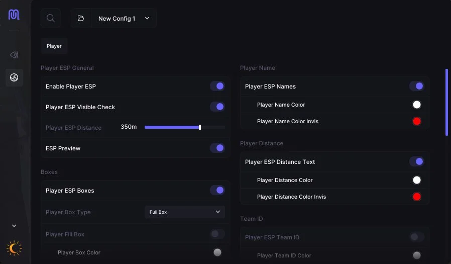- ESP — отображение игроков: ники, дистанция, боксы, скелеты, видимость